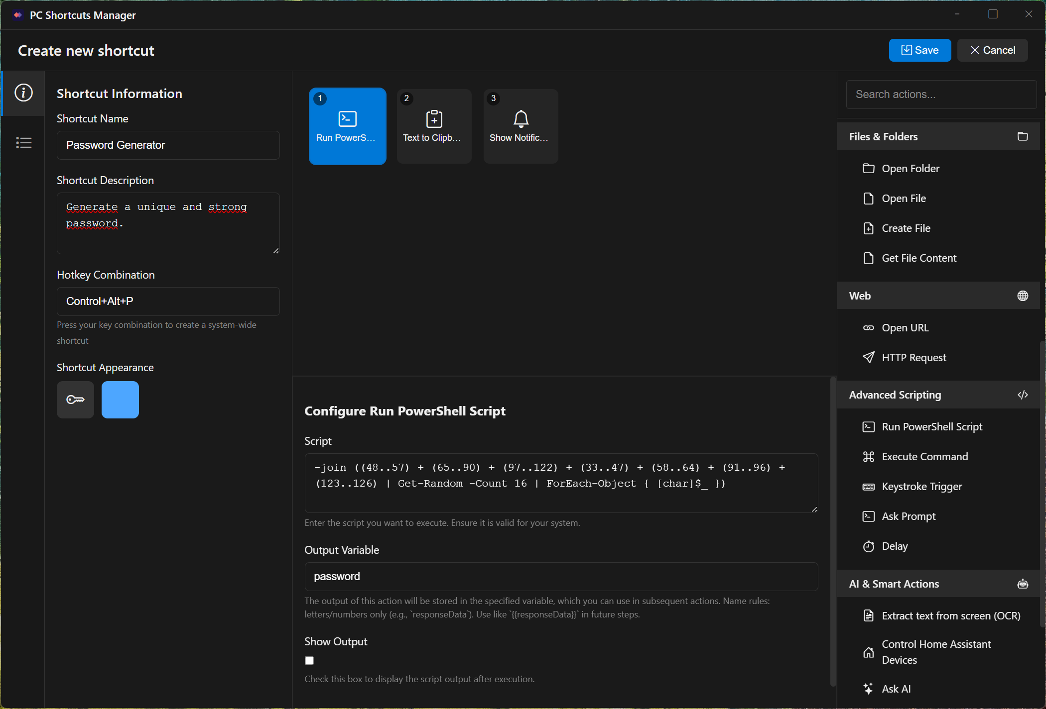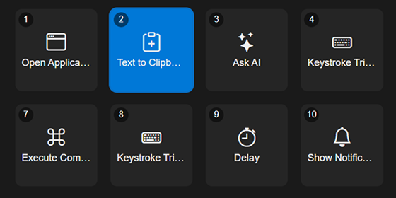 Chain PowerShell scripts, OCR text recognition, keystroke simulation, and file operations into a single shortcut.