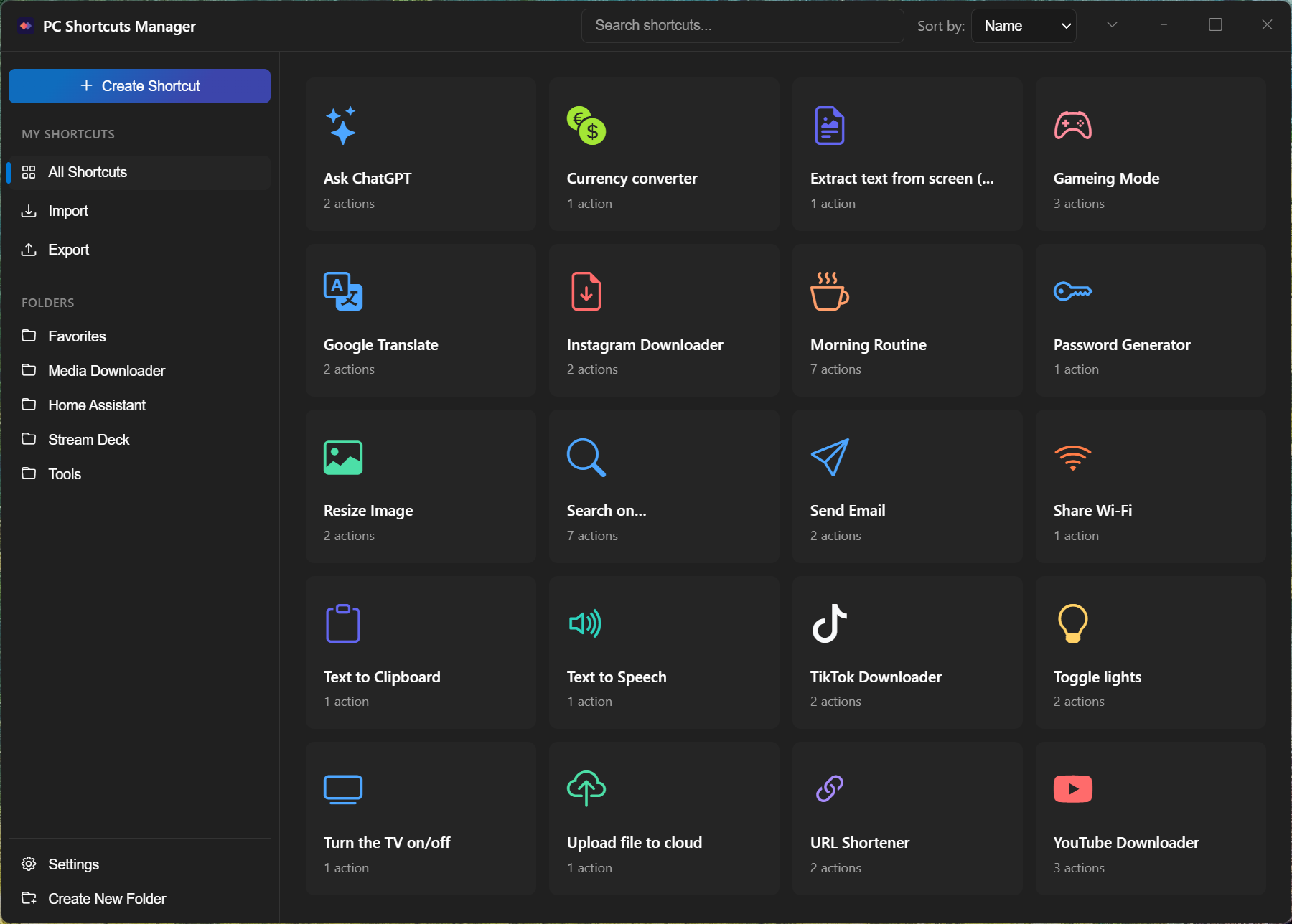 PC Shortcuts Manager enables users to streamline their Windows workflows by creating powerful, multi-action shortcuts. Instead of performing repetitive tasks manually, users can automate complex processes with a single keystroke or click.